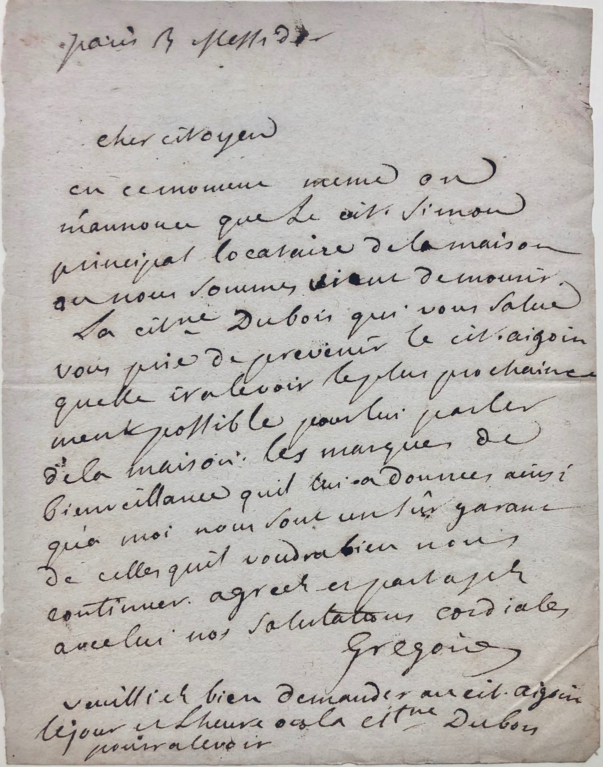 en ce moment même on m’annonce que le cit.[oyen] Simon principal locataire de la maison où nous sommes vient de mourir. La cit[oyen]ne Dubois qui vous salue vous prie de prévenir le cit. Aigoin qu’elle ira le voir le plus prochainement possible pour lui parler de la maison. Les marques de bienveillance qu’il lui a données ainsi qu’à moi nous sont un sûr garant de celles qu’il voudra bien nous continuer. Agréez et partagez avec lui nos salutations cordiales.
