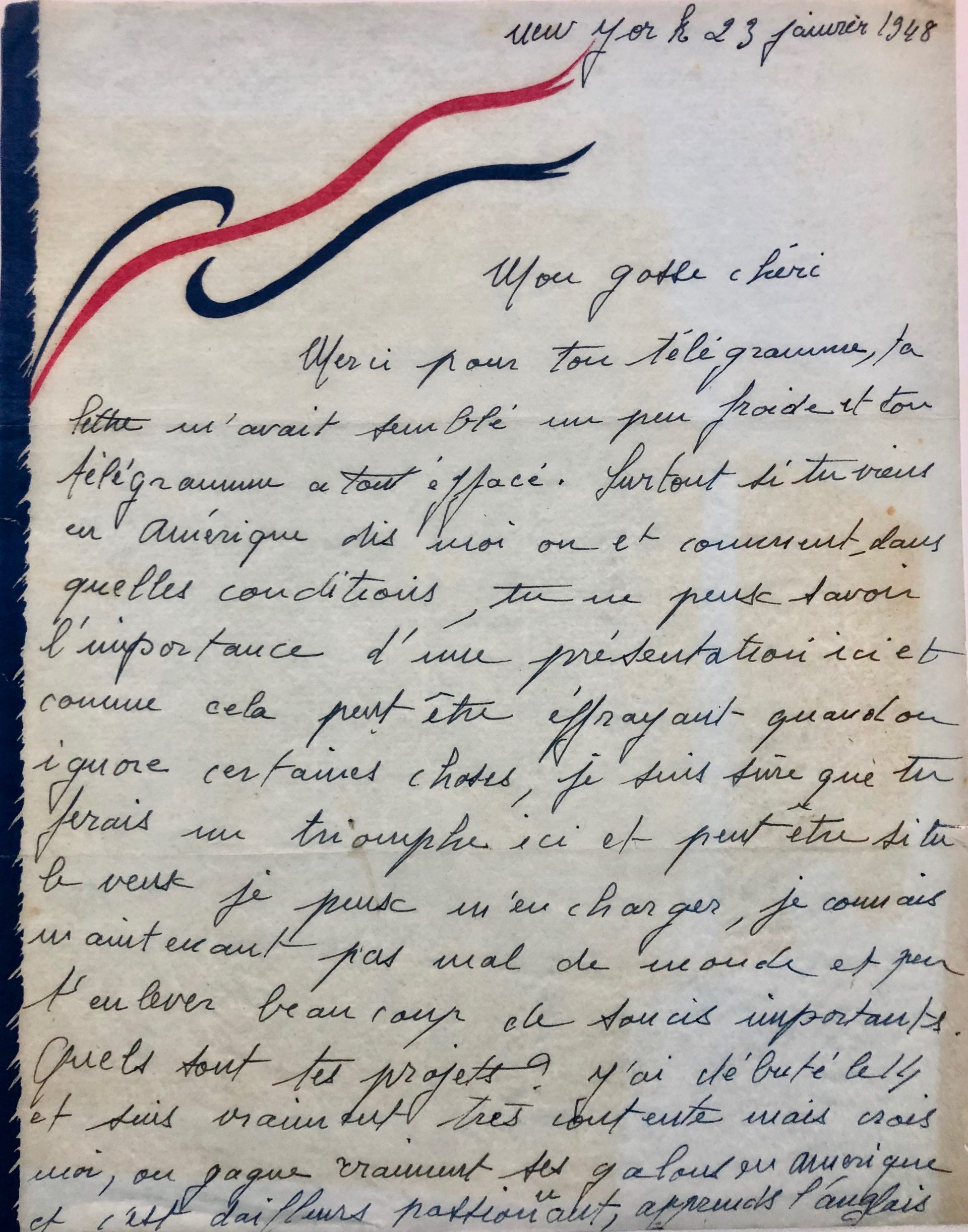 Lettre autographe signée « ta Pupuce » adressée à Yves Montand – New York, 23 janvier 1948 – 2 pp. in-4 sur papier pelure bleuté (Air France ?).