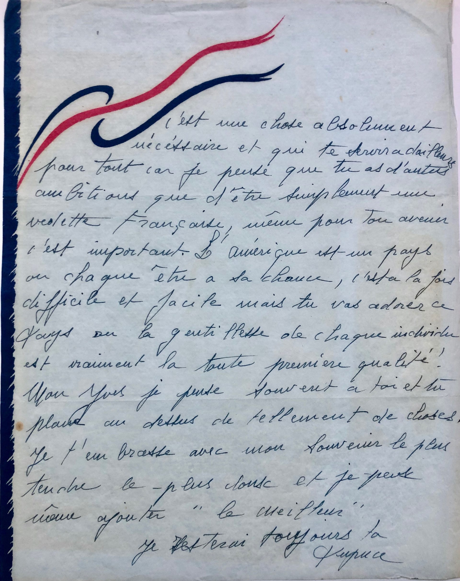 Merci pour ton télégramme, ta lettre m’avait semblé un peu froide et ton télégramme a tout effacé. Surtout si tu viens en Amérique dis-moi où et comment, dans quelles conditions, tu ne peux savoir l’importance d’une présentation ici et comme cela peut être effrayant quand on ignore certaines choses, je suis sûre que tu ferais un triomphe ici et peut-être si tu le veux je peux m’en charger, je connais maintenant pas mal de monde et peux t’enlever beaucoup de soucis importants. Quels sont tes projets ? J’ai débuté le 14 et suis vraiment très contente mais crois moi, on gagne vraiment ses galons en Amérique et c’est d’ailleurs passionnant, apprends l’anglais c’est une chose absolument nécessaire et qui te servira d’ailleurs pour tout car je pense que tu as d’autres ambitions que d’être simplement une vedette française, même pour ton avenir c’est important. L’Amérique est un pays où chaque être a sa chance, c’est à la fois difficile et facile mais tu vas adorer ce pays où la gentillesse de chaque individu est vraiment la toute première qualité !