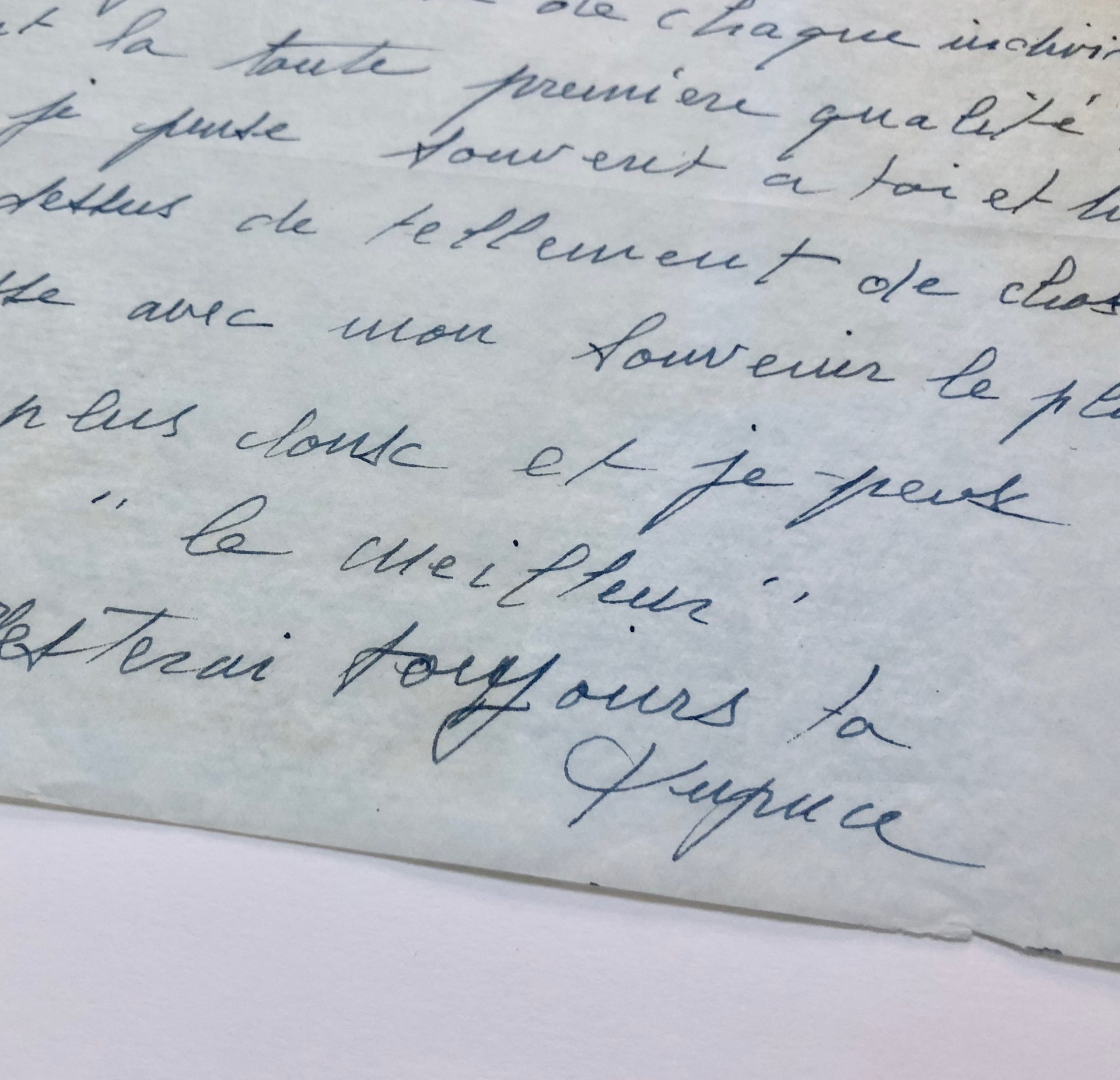 Mon Yves, je pense souvent à toi et tu planes au-dessus de tellement de choses. Je t’embrasse avec mon souvenir le plus tendre, le plus doux et je pense même ajouter « le meilleur ». Je resterai toujours ta Pupuce. »