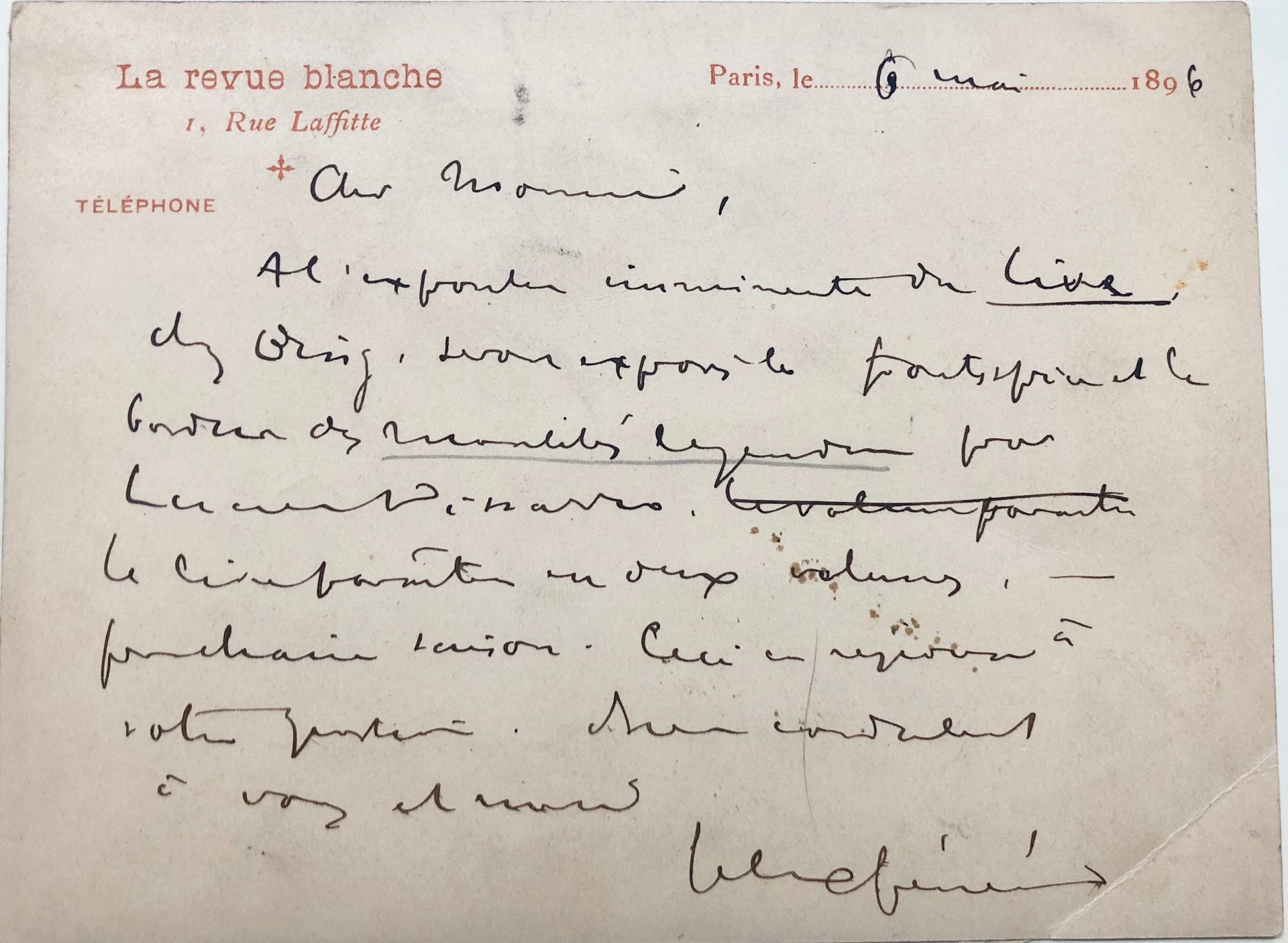 Félix Fénéon est secrétaire de rédaction, puis rédacteur en chef de La Revue blanche de 1896 à 1903. La carte est adressée à Léon-Paul Fargue, alors âgé de vingt ans, qui s’est forgé un début de notoriété avec la publication en 1895 de Tancrède, son premier livre. Fargue s’intéresse alors à toutes les formes d’art, dont la musique notamment, mais aussi la peinture. Félix Fénéon répond à une demande du jeune poète et l’informe que le frontispice et le bandeau du recueil de contes de Jules Laforgue, Les Moralités légendaires, seront exposés dans la galerie du collectionneur Samuel Bing, alors que l’œuvre fait elle-même l’objet d’une réédition par Le Mercure de France.