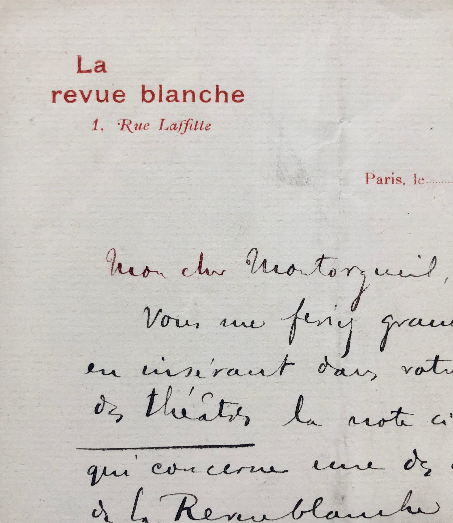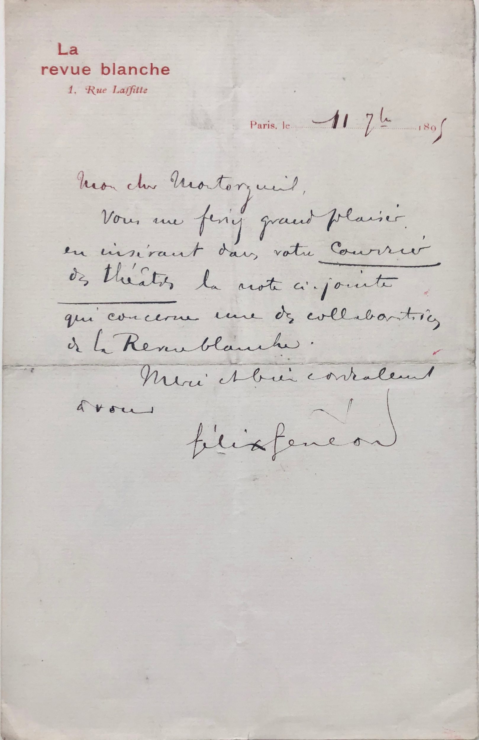 « Vous me feriez grand plaisir en insérant dans votre Courrier des théâtres la note ci-jointe qui concerne une des collaboratrices de La Revue blanche. Merci et bien cordialement à vous. »
