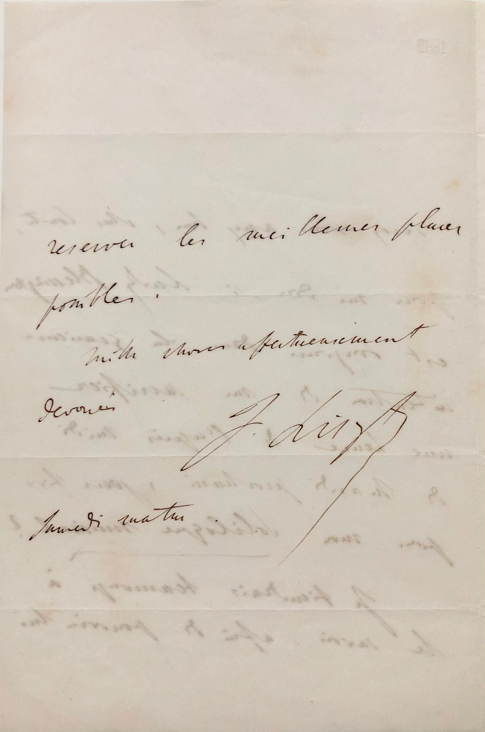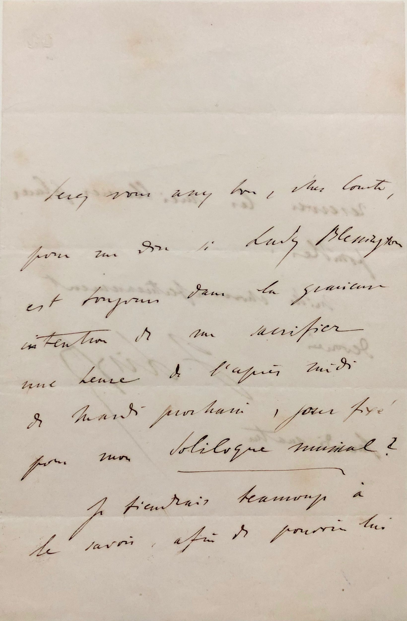 « Serez-vous assez bon, cher Comte, pour me dire si Lady Blessington est toujours dans la généreuse intention de me sacrifier une heure de l’après-midi de mardi prochain, jour fixé pour mon Soliloque Musical ?