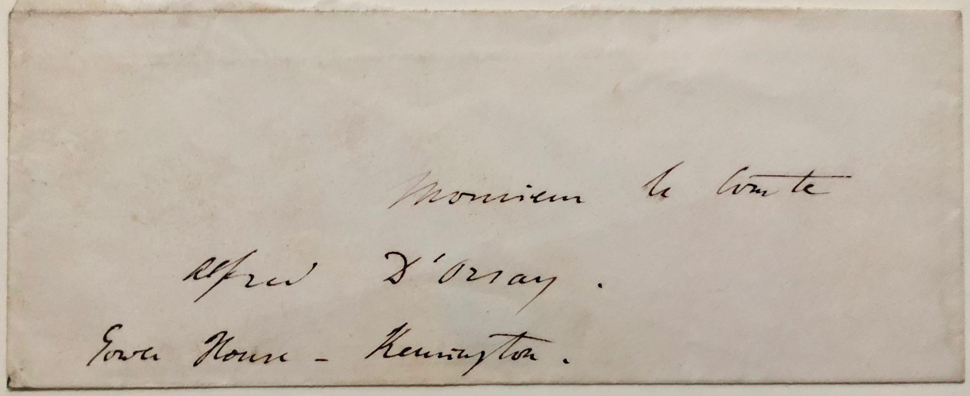 Lettre autographe signée adressée au comte Alfred d’Orsay – [Londres, probablement le 6 juin 1840] – 2 pp. sur un double feuillet in-8, enveloppe conservée : Monsieur le Comte Alfred d’Orsay / Grove House / Kensington.