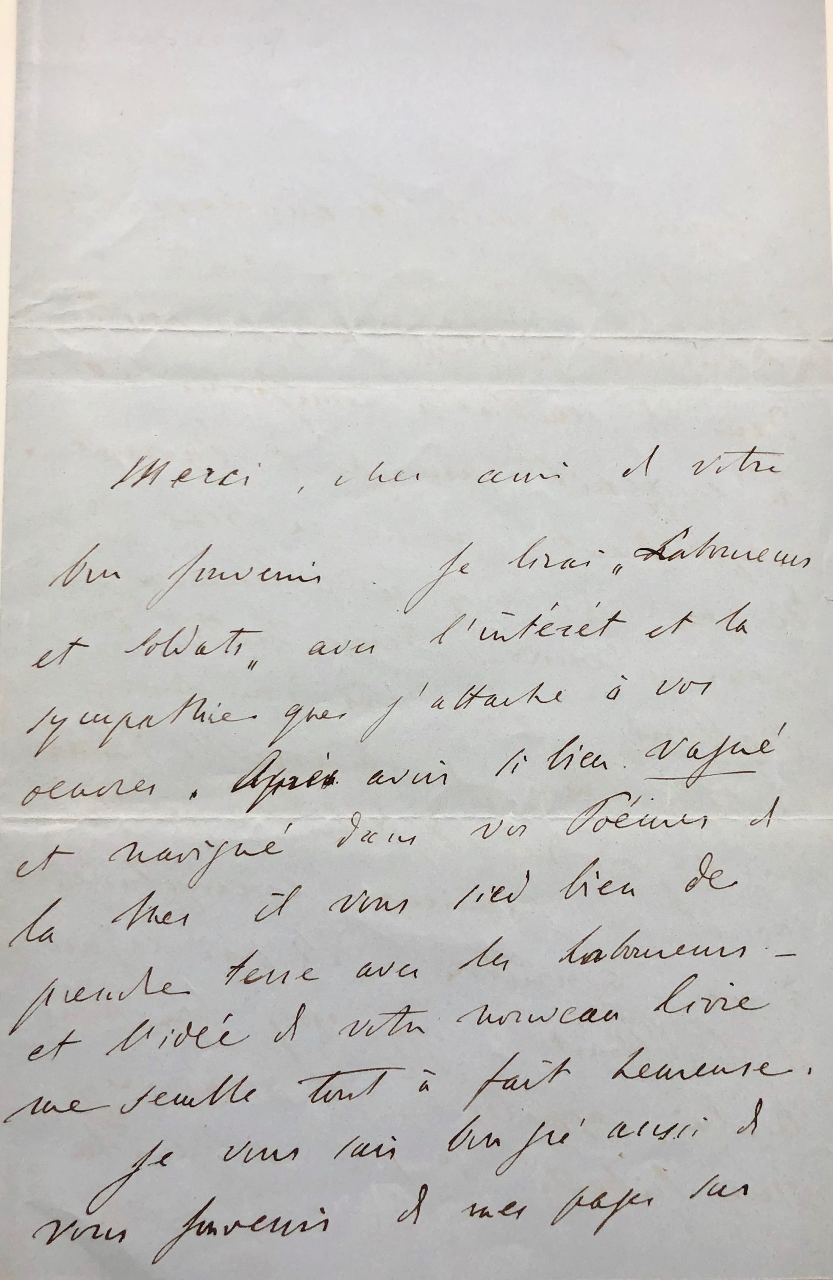 « Merci, cher ami, de votre bon souvenir. Je lirai « Laboureurs et Soldats » avec l’intérêt et la sympathie que j’attache à vos œuvres. Après avoir si bien vogué et navigué dans vos Poèmes de la mer, il vous sied bien de prendre terre avec les laboureurs, et l’idée de votre nouveau livre me semble tout à fait heureuse.