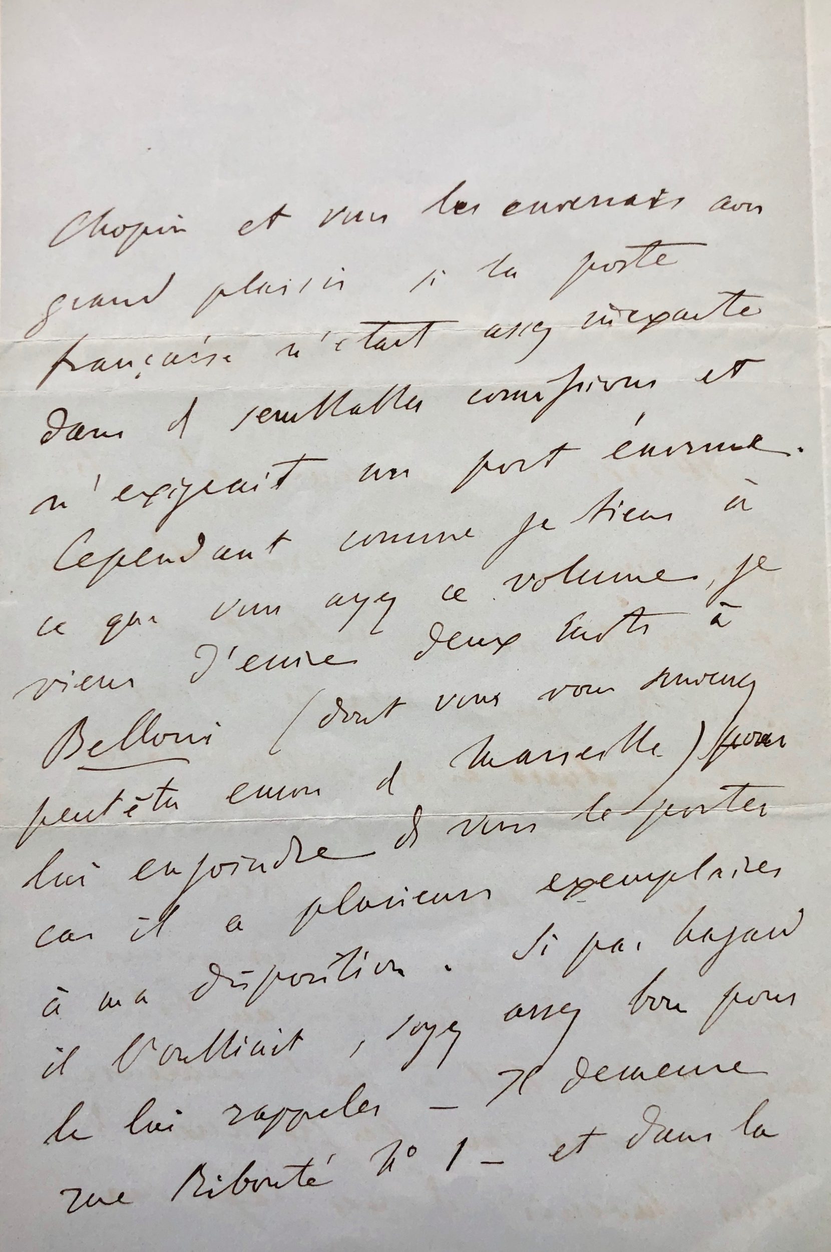Cependant comme je tiens à ce que vous ayez ce volume, je viens d’écrire deux mots à Belloni (dont vous vous souvenez peut-être encore de Marseille) pour lui enjoindre de vous le porter car il a plusieurs exemplaires à ma disposition. Si par hasard il l’oubliait, soyez assez bon pour le lui rappeler – Il demeure rue Ribouté n°1 – et dans la journée il est presque constamment établi au Bureau de la France musicale chez Escudier rue de Choiseul et – Pardonnez-moi ces longues explications à propos de si peu – mais comme j’ai eu plusieurs désagréments avec la poste de Paris je me tiens désormais en garde –