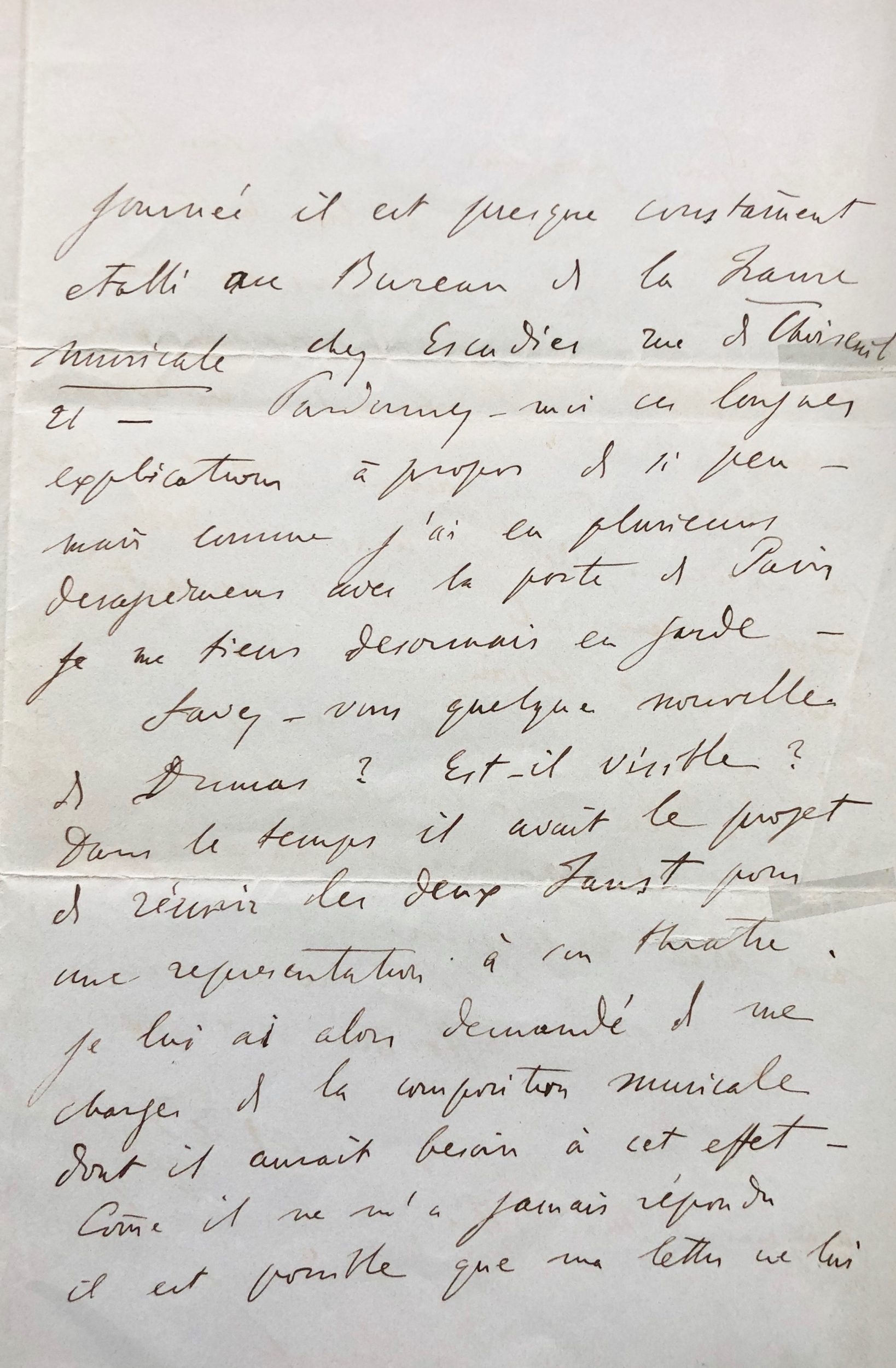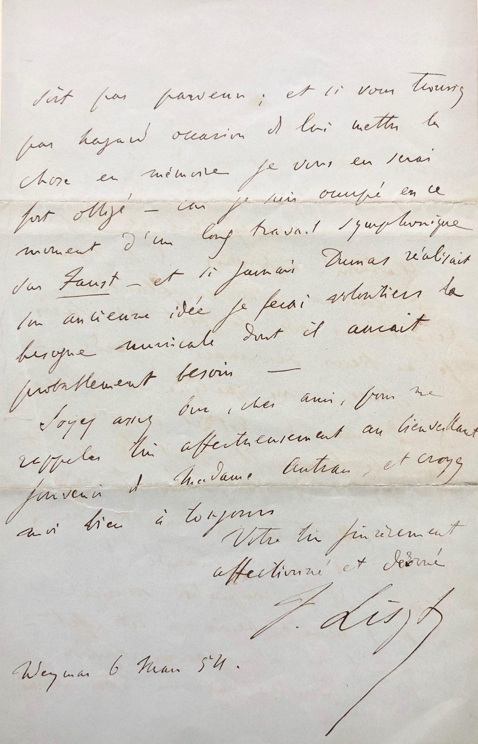 Savez-vous quelque nouvelle de Dumas ? Est-il visible ? Dans le temps il avait le projet de réunir les deux Faust pour une représentation à son théâtre. Je lui ai alors demandé de me charger de la composition musicale dont il aurait besoin à cet effet. Comme il ne m’a jamais répondu, il est possible que ma lettre ne lui soit pas parvenue ; et si vous trouvez par hasard occasion de lui mettre la chose en mémoire je vous en serai obligé – car je suis occupé en ce moment d’un long travail symphonique sur Faust – et si jamais Dumas réalisait son ancienne idée, je ferais volontiers la besogne musicale dont il aurait probablement besoin. Soyez assez bon, cher ami, pour me rappeler bien affectueusement au bienveillant souvenir de Madame Autran, et croyez-moi bien à toujours, votre très sincèrement affectionné et dévoué. »