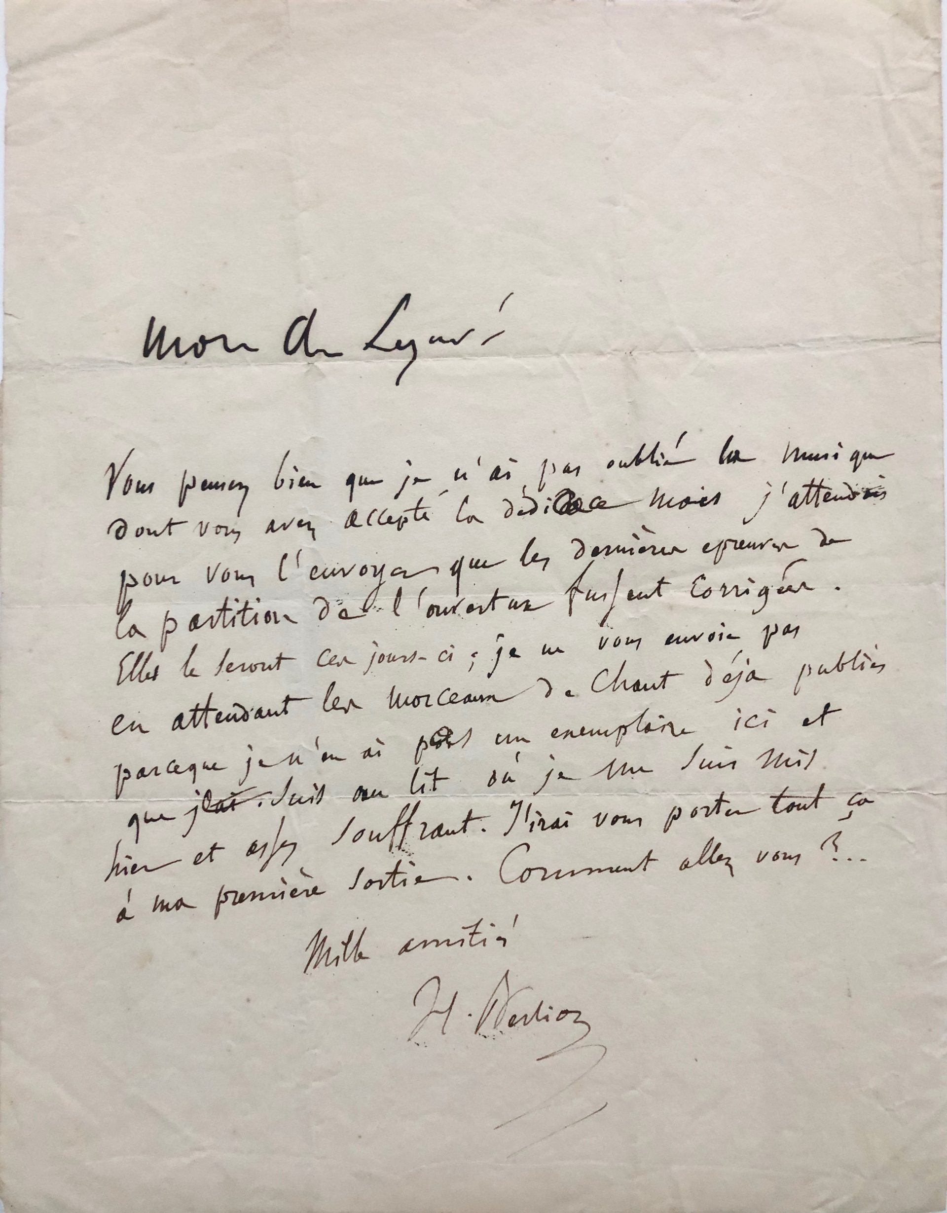 Vous pensez bien que je n’ai pas oublié la musique dont vous avez accepté la dédicace mais j’attendais pour vous l’envoyer que les dernières épreuves de la partition de l’ouverture fussent corrigées.