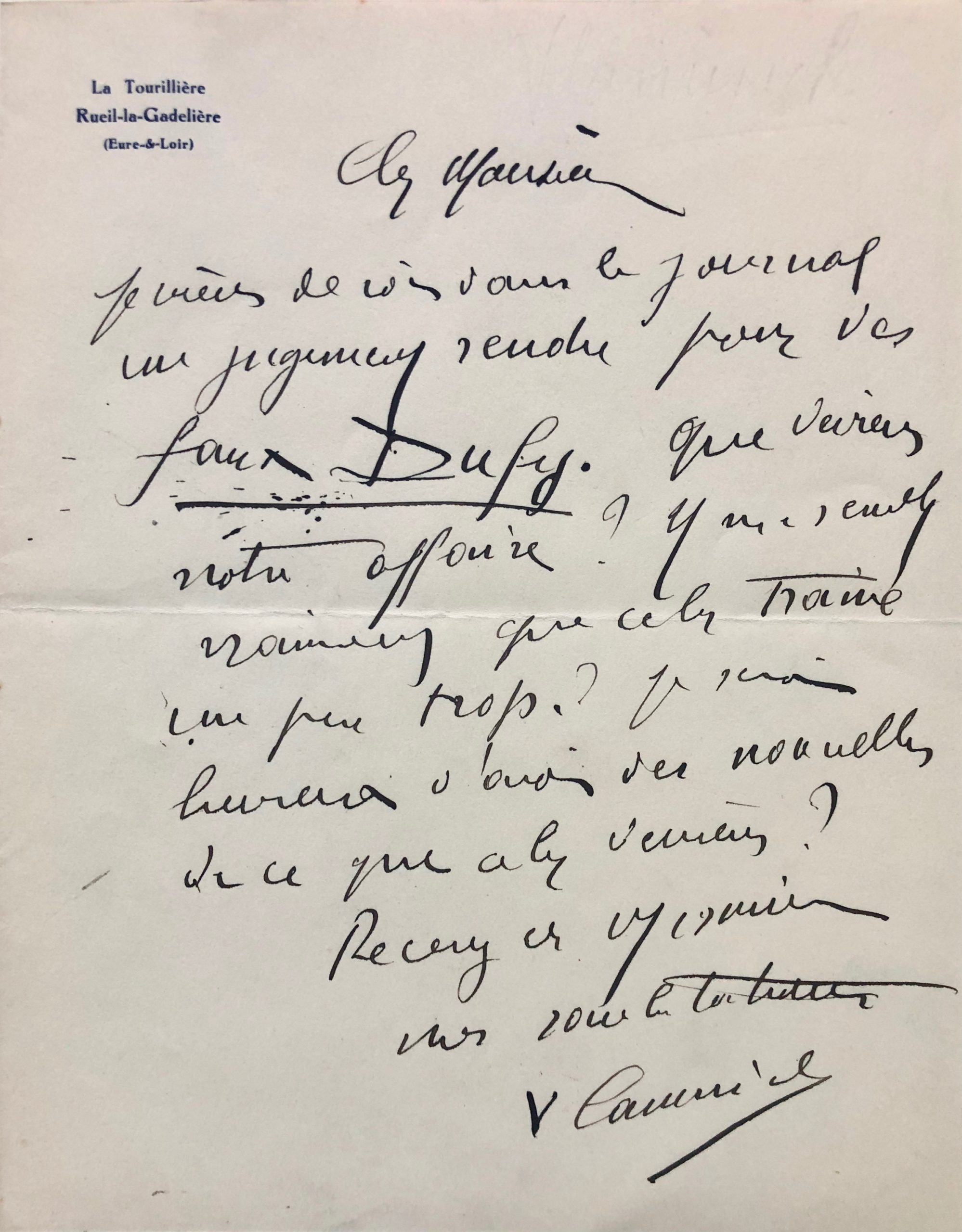« Je viens de voir dans le journal un jugement rendu pour des faux Dufy. Que devient notre affaire ? Il me semble vraiment que cela traine un peu trop ? Je serais heureux d’avoir des nouvelles de ce que cela devient ? Recevez cher Monsieur mes salutations. »