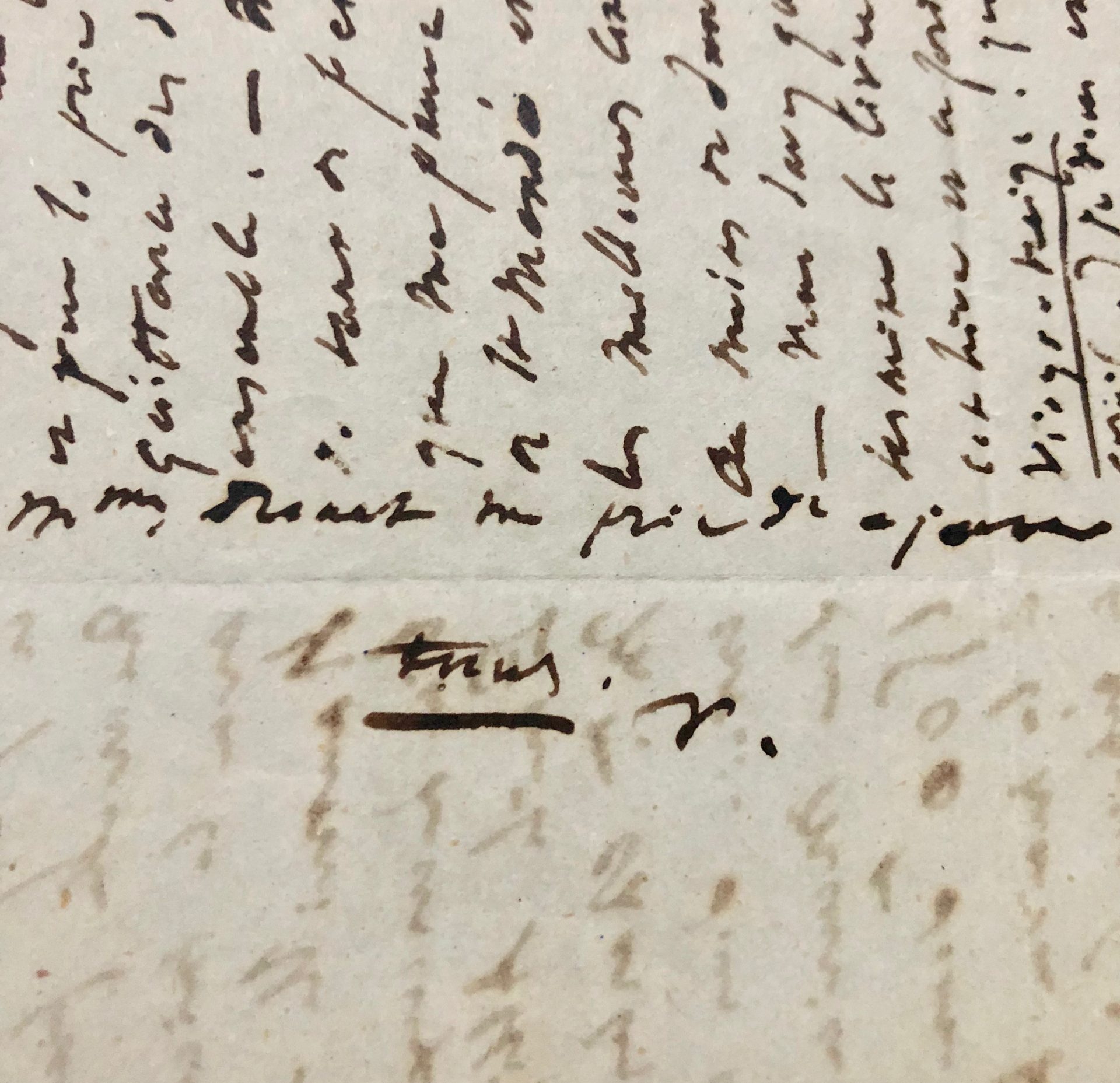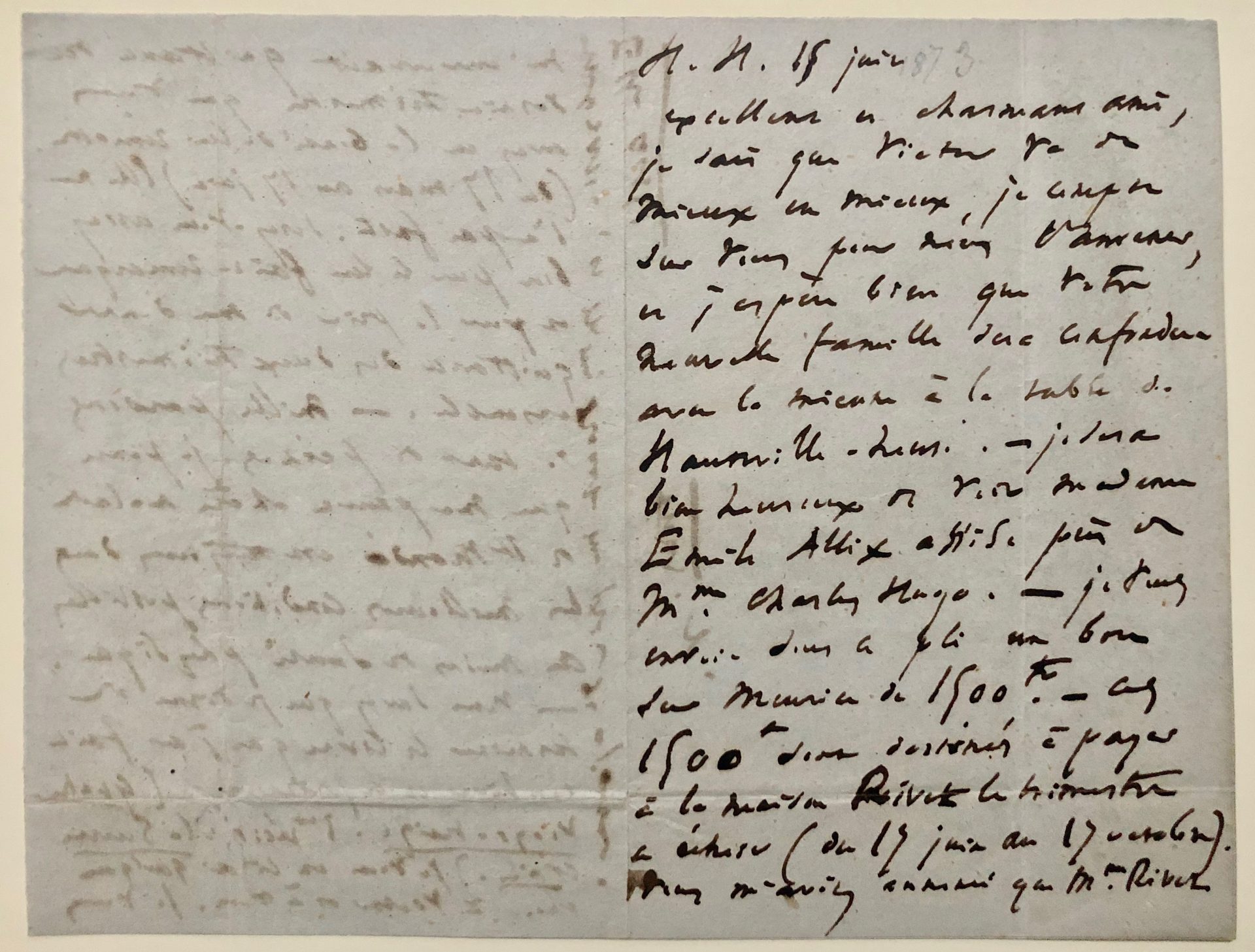 Je sais que Victor va de mieux en mieux [François-Victor (1828-1873), son second fils, mourra de la tuberculose quelques mois plus tard, le 26 décembre], je compte sur vous pour nous l’amener et j’espère bien que votre nouvelle famille [le docteur Allix vient de se marier] sera confondue avec la mienne à la table de Hauteville House . Je serai bien heureux de voir Madame Émile Allix assise près de Madame Charles Hugo. Je vous envoie dans ce pli un bon sur [?] de 1500 fr – Ces 1500 fr sont destinés à payer à la maison Rivet le trimestre à échoir (du 17 juin au 17 octobre). Vous m’aviez annoncé que Madame Rivet m’enverrait quittance du dernier trimestre que vous avez eu la bonté de lui remettre (du 17 mars au 17 juin). Elle ne l’a pas fait. Seriez-vous assez bon pour lui faire remarquer et pour la prier de me donner quittance des deux trimestres ensemble. Mille pardons de toutes ces peines. Je pense que ma pauvre chère malade à Saint-Mandé est toujours dans les meilleures conditions possibles au moins de santé physique. Vous savez que je viens de terminer le livre que j’ai fait cet hiver et ce printemps (Quatre-vingt treize. 1er récit : la Guerre civile.) Je vous en lirai quelque chose à Victor et à vous. Je vous embrasse et Mme Drouet me prie de le faire. Elle aussi. »