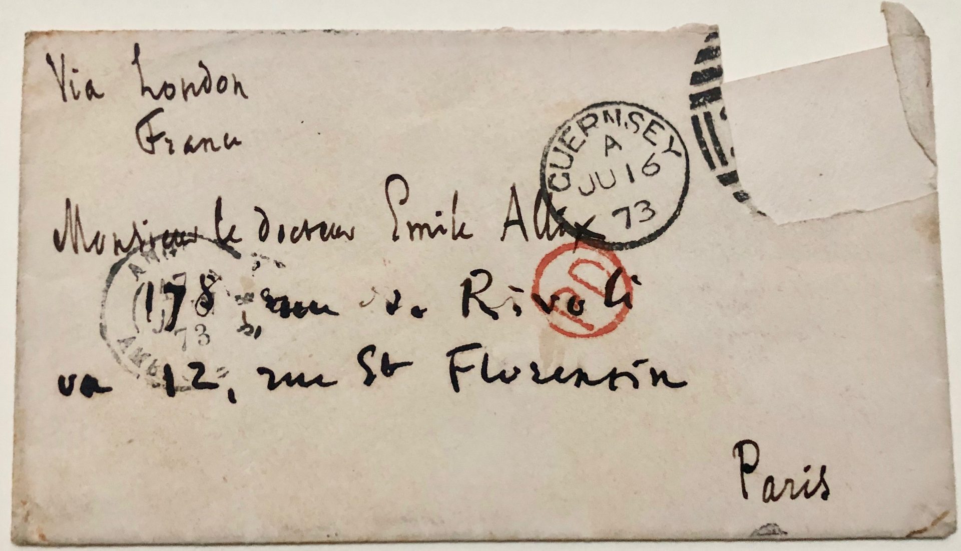 Lettre autographe signée V. adressée au docteur Émile Allix – Hauteville House, Guernesey, 15 juin [1873] – 2 pp. in-24 (7,8 x 12 cm), enveloppe conservée, avec adresse et marques postales, timbre découpé.