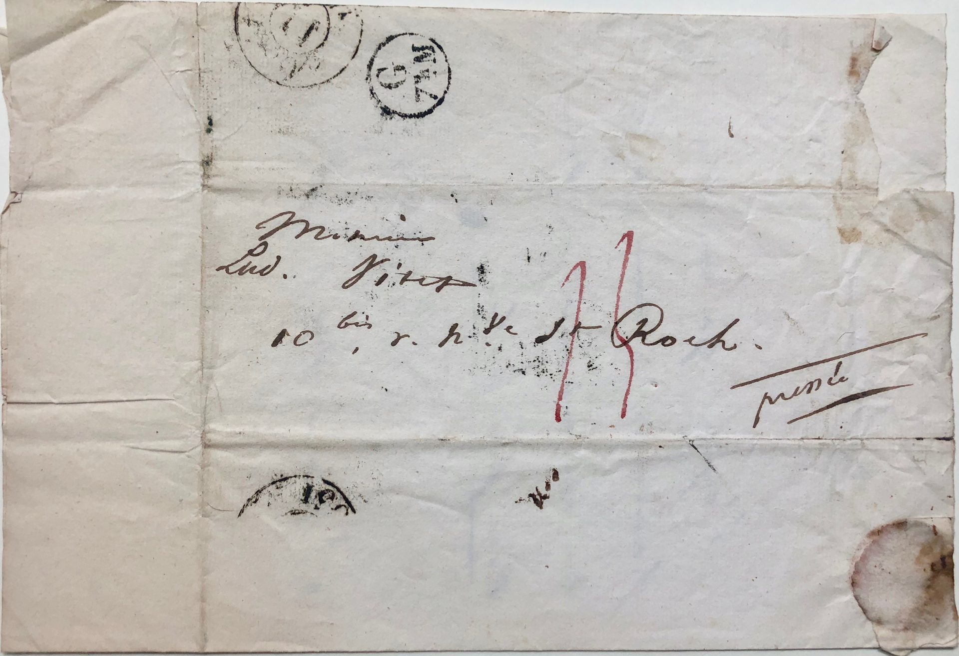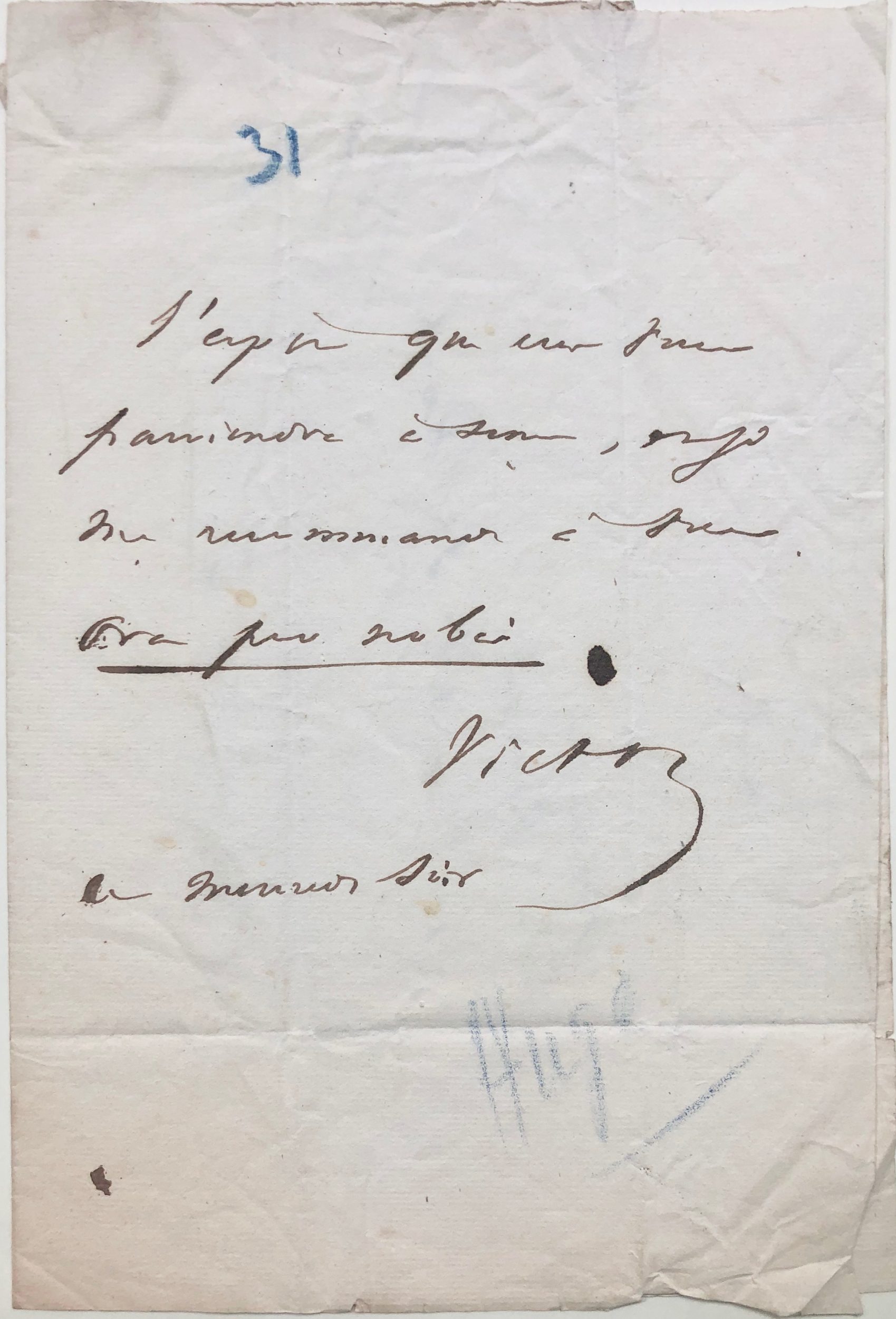 Lettre autographe signée « Victor » adressée à Ludovic Vitet – [Paris, probablement le 10 août 1831], ce mercredi soir – 1 page in-12, adresse et cachet au verso avec la mention « pressé » ; ajouts postérieurs d’une autre main au crayon bleu « 31 » et « Hugo ».